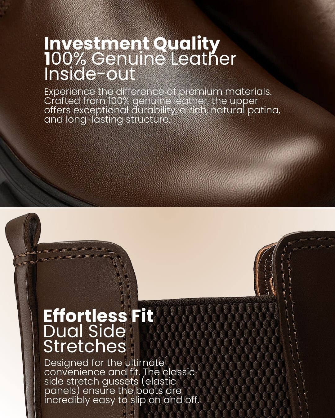 Crafted from 100% premium genuine leather, these boots offer a rich, smooth finish that not only looks sophisticated but molds perfectly to your feet for superior comfort over time.